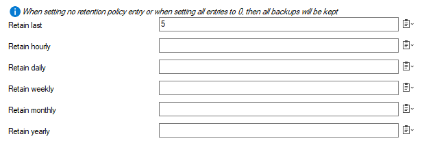 If you want to keep all backups indefinitely, set all Retain fields (e.g., last, hourly, daily, weekly, monthly, yearly) to '0'. Modify any of these fields to meet your individual retention requirements. As soon as one of these limits is exceeded, all backups that surpass the limit will be deleted automatically.