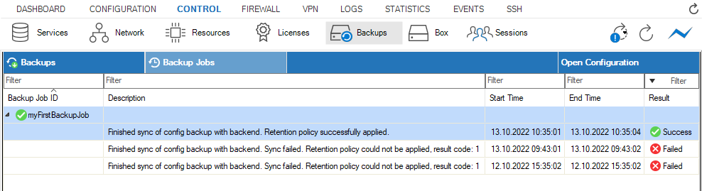 You can monitor your backups and their state at CONTROL > Backups. There are two views that provide all relevant information on all backup files and on the result of an action that was executed on each triggered backup: